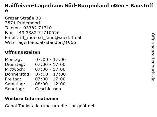 1 Raiffeisen-Lagerhaus Süd-Burgenland eGen - Haus & Garten (Entfernung: 0,00 km) Grazer Straße 33, 7571 Rudersdorf 5 Raiffeisen-Lagerhaus Süd-Burgenland Jennersdorf Genol Tankstelle (Entfernung: 13,45 km) Bahnhofring 11, 8380 Jennersdorf 6 Raiffeisen-Lagerhaus Süd-Burgenland eGen - Fachhandel/Shop Motor- & Gartentechnik und Rasenroboter (Entfernung: 13,45 km) Bahnhofring 11, 8380 Jennersdorf |
