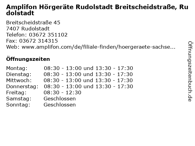3 Amplifon Hörgeräte Rudolstadt Otto-Nuschke-Straße, Rudolstadt (Entfernung: 1,45 km) Otto-nuschke-straße 6a, 07407 Rudolstadt 6 |