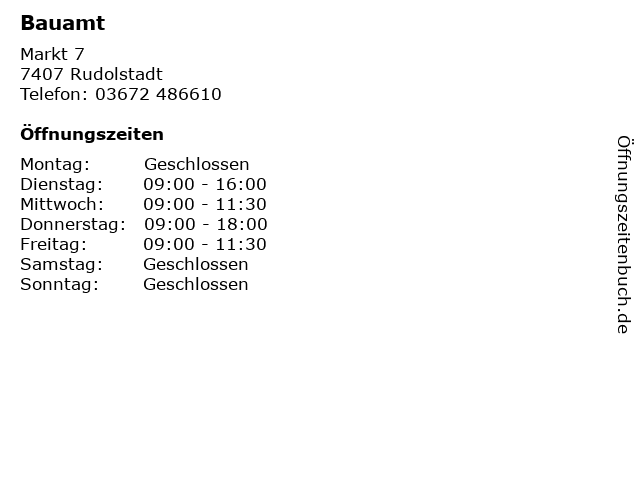 | Öffnungszeiten Bauamt in Rudolstadt anzeigen | |
