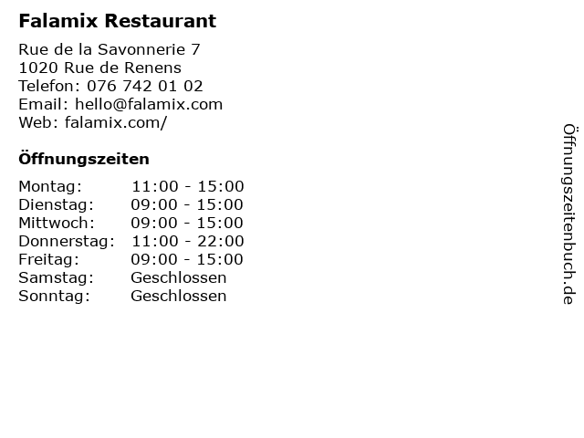 | Öffnungszeiten Falamix Restaurant in Rue de Renens anzeigen | |