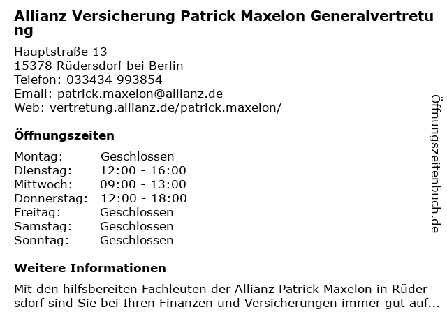 1 Allianz Versicherung Jens Mildner Generalvertretung (Entfernung: 5,63 km) Bahnhofstraße 16, 15344 Strausberg 4 Generalvertretung der Mecklenburgischen Versicherungsgruppe - Bernd Ballichar (Entfernung: 10,00 km) Brandenburgische Str. 151, 15566 Schöneiche 5 6 AXA Generalvertretung Doris und Hans-Jürgen Masch (Entfernung: 10,48 km) Mittelallee 29, 15344 Strausberg |