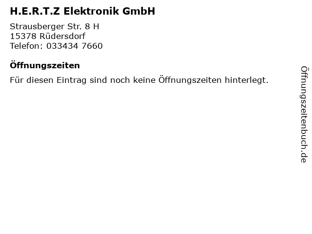 | Öffnungszeiten H.E.R.T.Z Elektronik GmbH in Rüdersdorf anzeigen | |