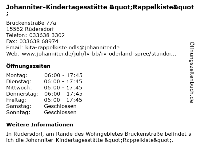 Branchen & Suchbegriffe zu Johanniter-Kindertagesstätte "Rappelkiste":"rappelkiste", agentur für kinderbetreuung, gemeinnützige organisation, hilfsorganisation, johanniter, kindertagesstätte, sozialarbeit, verband, wohlfahrtseinrichtung |