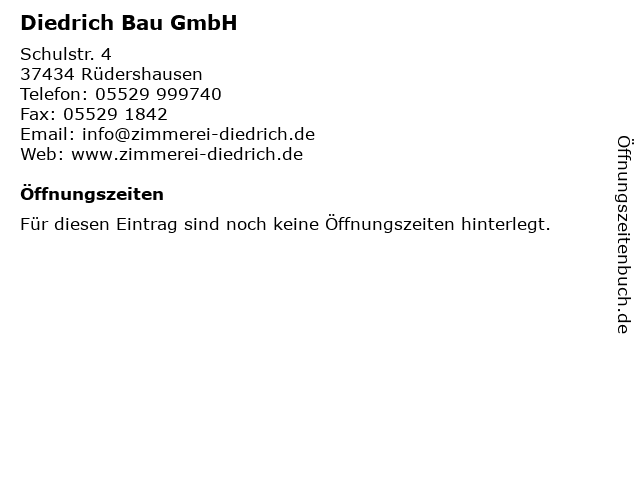 | Öffnungszeiten Diedrich Bau GmbH in Rüdershausen anzeigen | |