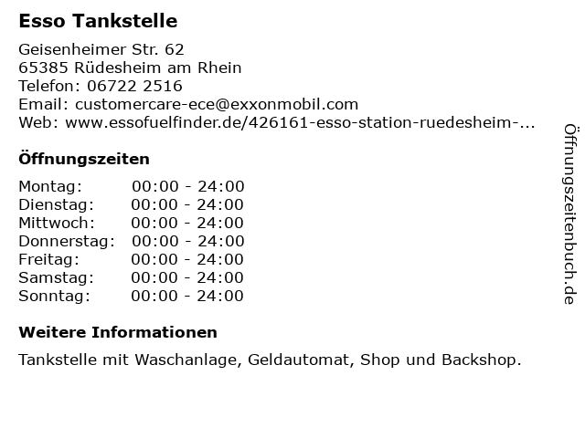 | Öffnungszeiten Esso Tankstelle in Rüdesheim am Rhein anzeigen | |