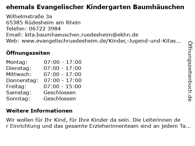 1 Ehemals Integrative Kindertagesstätte - jetzt geschlossen (Entfernung: 0,73 km) Hugo-asbach-str. 74, 65385 Rüdesheim am Rhein 3 Evangelischer Betsaal Lorch - Evangelische Kirchengemeinde Kaub (Entfernung: 11,18 km) Oberweg 4, 65391 Lorch 4 Evangelischer Kindertagesstätte Michaelisgemeinde (Entfernung: 13,67 km) Kreuznacher Str. 17, 55576 Sprendlingen 6 |
