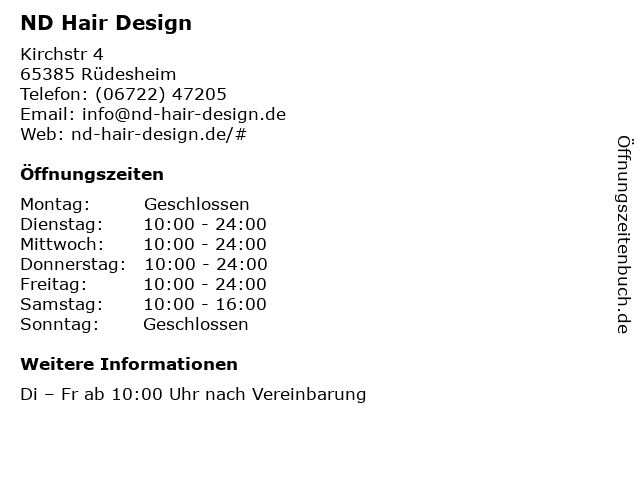 | Öffnungszeiten ND Hair Design in Rüdesheim anzeigen | |