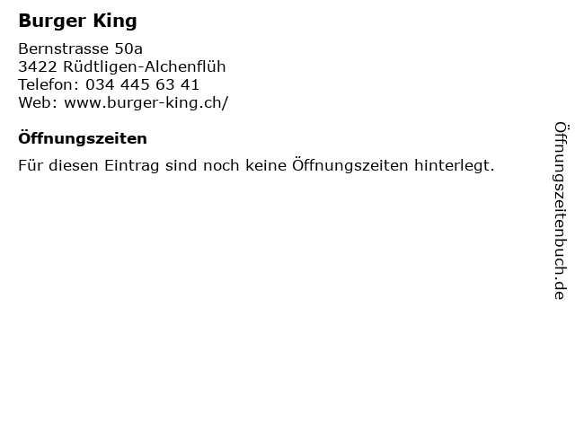 | Öffnungszeiten Burger King in Rüdtligen-Alchenflüh anzeigen | |