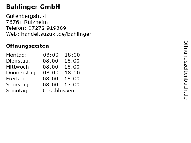 | Öffnungszeiten Bahlinger GmbH in Rülzheim anzeigen | |