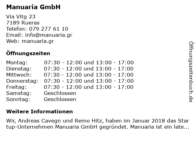 | Öffnungszeiten Manuaria GmbH in Rueras anzeigen | |