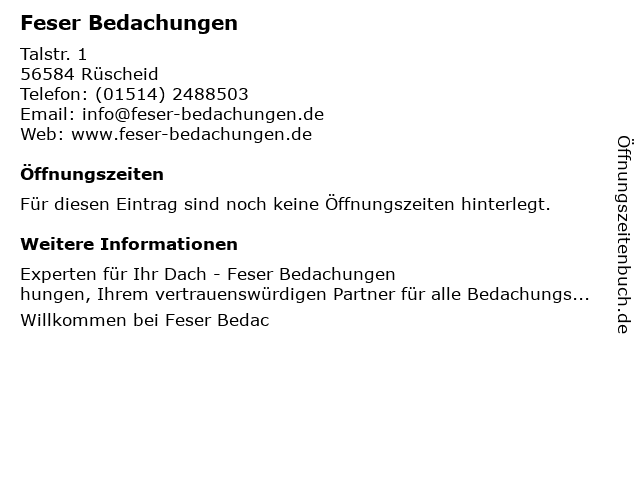 | Öffnungszeiten Feser Bedachungen in Rüscheid anzeigen | |