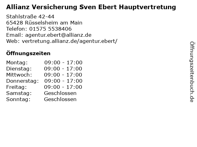 2 Schreiber & Ebert Sanitätshaus und Orthopädietechnik (Entfernung: 0,44 km) Eisenstraße 2 - 4, 64528 Rüsselsheim 3 Allianz Versicherung Ihtezaz Saleem Hauptvertretung (Entfernung: 0,64 km) Eisenstraße 51, 65428 Rüsselsheim am Main 4 Allianz Versicherung Kemal Bjelak Hauptvertretung (Entfernung: 0,64 km) Eisenstraße 51, 65428 Rüsselsheim am Main 6 |