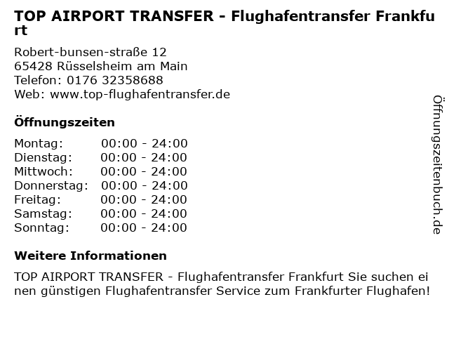 1 TOP AIRPORT TRANSFER - Flughafentransfer Frankfurt (Entfernung: 1,37 km) Am Borngraben 26, 65428 Rüsselsheim am Main 6 |