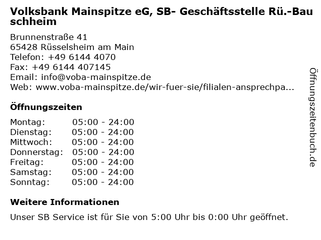 3 Evangelische Kirche Bauschheim - Evangelische Kirchengemeinde Bauschheim (Entfernung: 0,31 km) Wolfinger Straße 1, 65428 Rüsselsheim 6 Mainzer Volksbank (SB-Stelle Mainz Laubenheim) (Entfernung: 4,28 km) Rüsselsheimer Allee 2, 55130 Mainz |