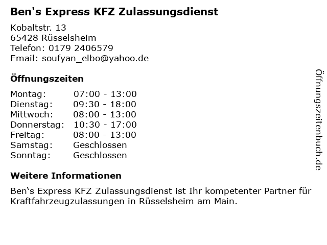 Branchen & Suchbegriffe zu Ben's Express KFZ Zulassungsdienst:ben's, express, kfz, zulassungsdienst |