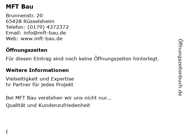 | Öffnungszeiten MFT Bau in Rüsselsheim anzeigen | |