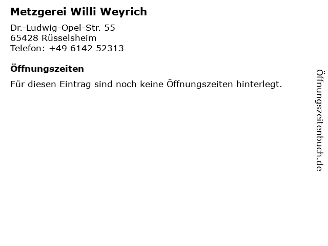 | Öffnungszeiten Metzgerei Willi Weyrich in Rüsselsheim anzeigen | |
