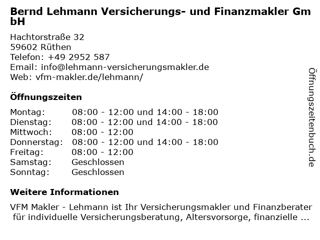 1 Bernd Lehmann Versicherungs- und Finanzmakler GmbH (Entfernung: 0,02 km) Hachtorstr. 32, 59602 Rüthen 2 Allianz Versicherung Lehmann u. Schuster Inh. Christina Lehmann Hauptvertretung (Entfernung: 17,46 km) Bäckstraße 19, 59590 Geseke 6 Rainer Rohe - Unabhängiger Versicherungsmakler (Entfernung: 45,08 km) Franz-Kissing-Straße 5, 58706 Menden |