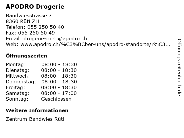 | Öffnungszeiten APODRO Drogerie in Rüti ZH anzeigen | |