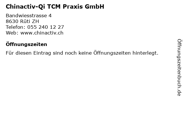 | Öffnungszeiten Chinactiv-Qi TCM Praxis GmbH in Rüti ZH anzeigen | |