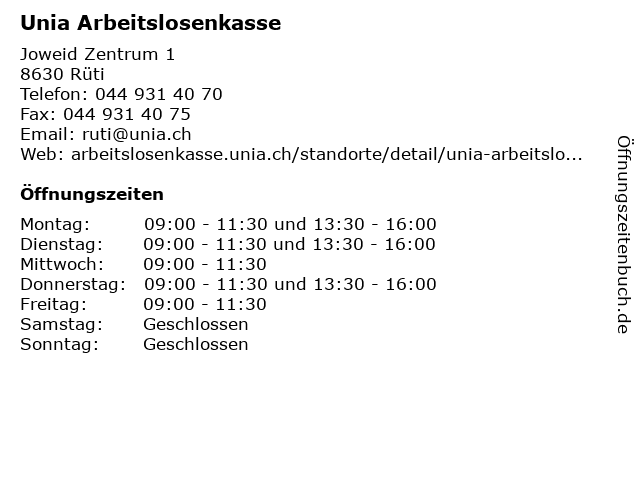 | Öffnungszeiten Unia Arbeitslosenkasse in Rüti anzeigen | |