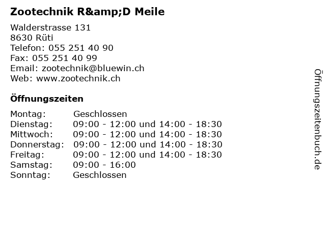 | Öffnungszeiten Zootechnik R&D Meile in Rüti anzeigen | |