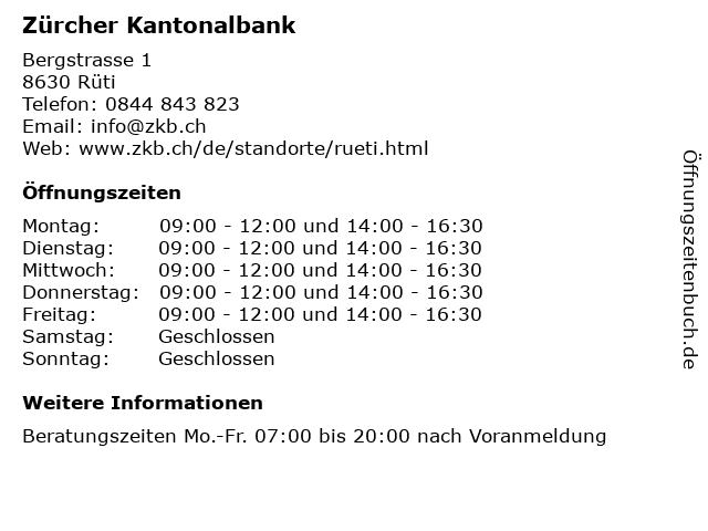 | Öffnungszeiten Zürcher Kantonalbank in Rüti anzeigen | |