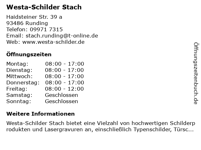 | Öffnungszeiten Westa-Schilder Stach in Runding anzeigen | |