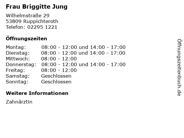 | Öffnungszeiten Frau Briggitte Jung in Ruppichteroth anzeigen | |