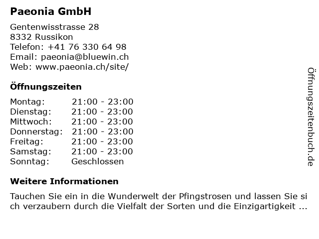 | Öffnungszeiten Paeonia GmbH in Russikon anzeigen | |