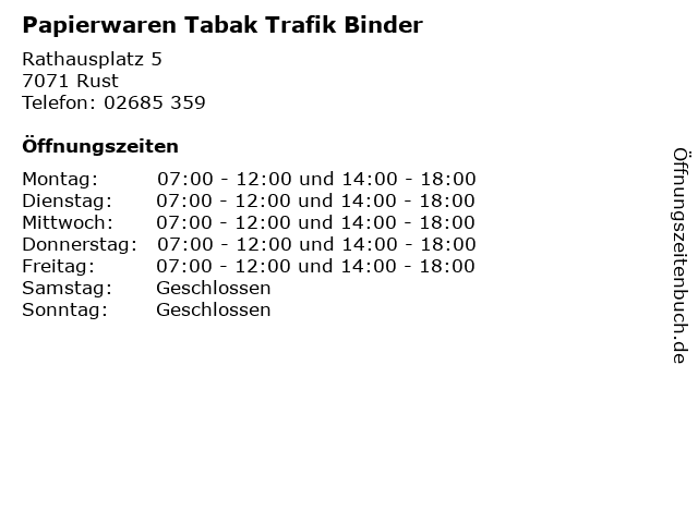 | Öffnungszeiten Papierwaren Tabak Trafik Binder in Rust anzeigen | |