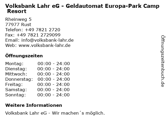 5 Volksbank Lahr eG - Geldautomat Europa-Park Griechenland (Entfernung: 0,80 km) Europa-Park-Straße 2, 77977 Rust 6 Volksbank Lahr eG - Geldautomat Europa-Park Spanische Arena (Entfernung: 1,28 km) Europa-Park-Straße 4-6, 77977 Rust |