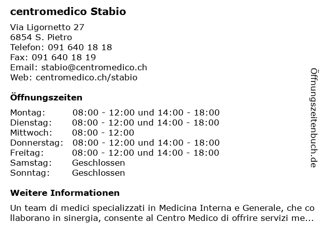 | Öffnungszeiten centromedico Stabio in S. Pietro anzeigen | |