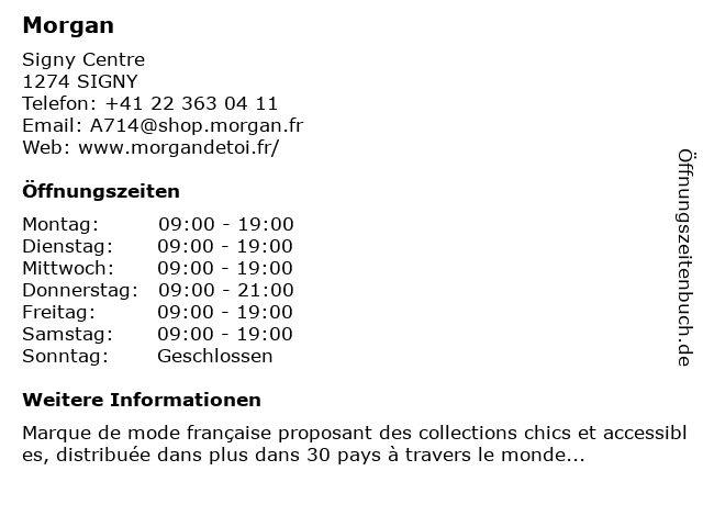 | Öffnungszeiten Morgan in SIGNY anzeigen | |
