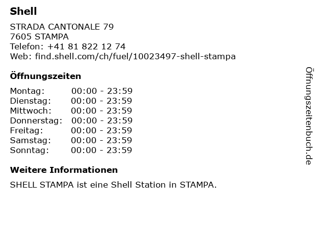 | Öffnungszeiten Shell in STAMPA anzeigen | |