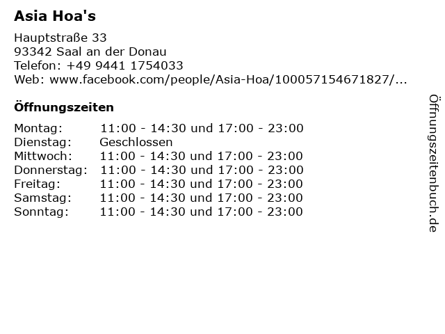 | Adresse Asia Hoa's in Saal an der Donau anzeigen |