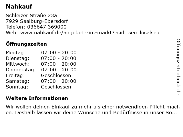 | Öffnungszeiten Nahkauf in Saalburg-Ebersdorf anzeigen | |