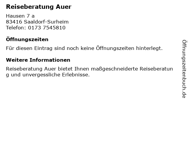 | Öffnungszeiten Reiseberatung Auer in Saaldorf-Surheim anzeigen | |