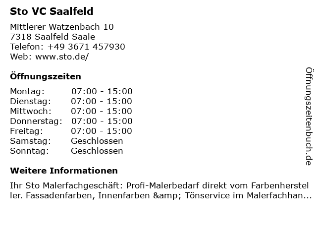 | Öffnungszeiten Sto VC Saalfeld in Saalfeld Saale anzeigen | |