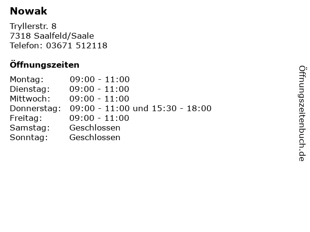 | Öffnungszeiten Nowak in Saalfeld/Saale anzeigen | |
