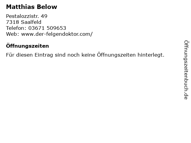 | Öffnungszeiten Matthias Below in Saalfeld anzeigen | |