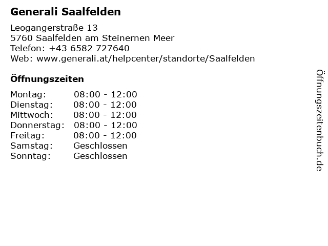 1 Generali Versicherung AG - Geschäftsstelle Saalfelden (Entfernung: 0,00 km) Leoganger Straße 13, 5760 Saalfelden 6 |