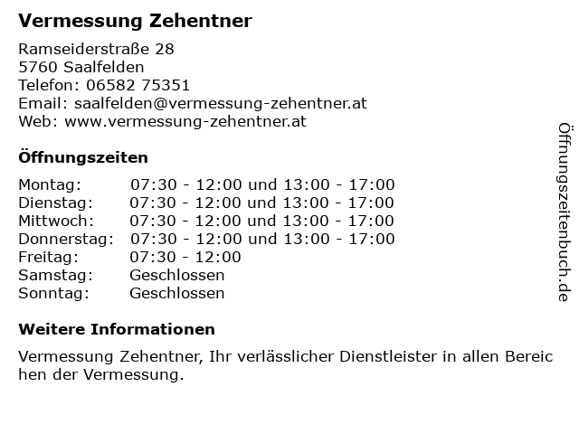 | Öffnungszeiten Vermessung Zehentner in Saalfelden anzeigen | |