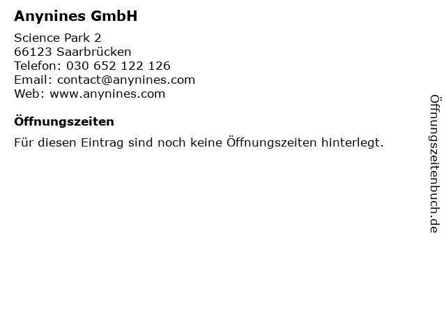| Öffnungszeiten Anynines GmbH in Saarbrücken anzeigen | |