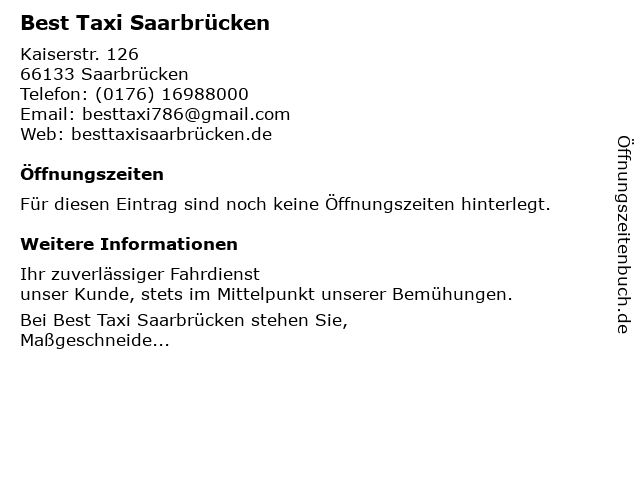 | Öffnungszeiten Best Taxi Saarbrücken in Saarbrücken anzeigen | |