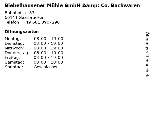 1 Bäckerei Biebelhausener Mühle GmbH & Co. KG (Entfernung: 5,13 km) Am Hauptbahnhof 4, 66111 Saarbrücken 6 Bäckerei Biebelhausener Mühle GmbH & Co. KG (Entfernung: 14,01 km) Elsässer Straße 74, 66271 Kleinblittersdorf |