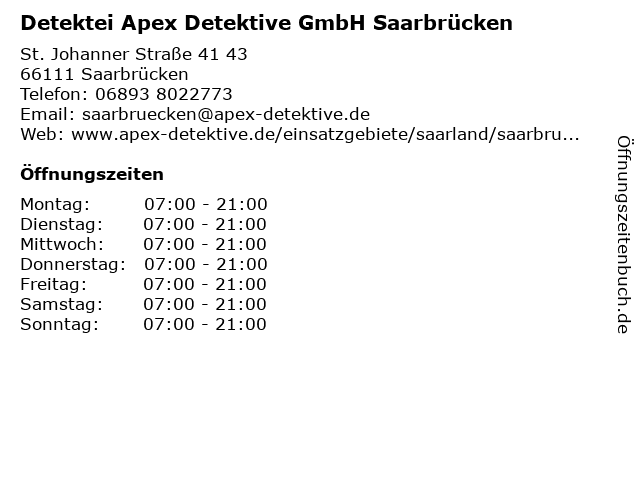 Öffnungszeiten Detektei Apex Detektive GmbH Saarbrücken