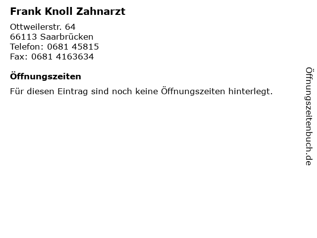 | Öffnungszeiten Frank Knoll Zahnarzt in Saarbrücken anzeigen | |