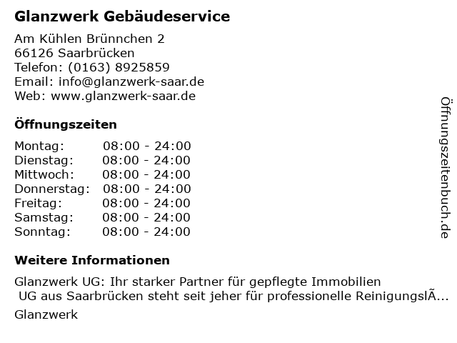 | Öffnungszeiten Glanzwerk Gebäudeservice in Saarbrücken anzeigen | |