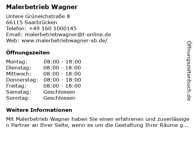 | Öffnungszeiten Malerbetrieb Wagner in Saarbrücken anzeigen | |